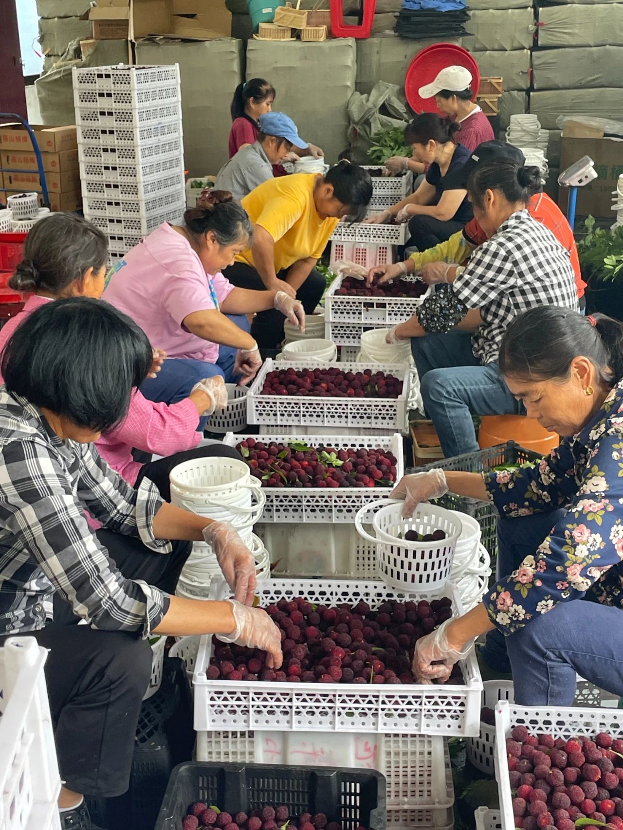 在燕山杨梅基地里,果农们正忙碌地挑拣、打包。这批当天采摘的新鲜杨梅封装后被送往百安港水果交易区档口。